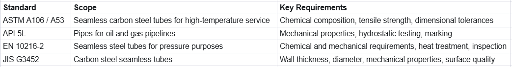 Hot rolled seamless steel tubes must meet strict standards to ensure reliable performance. Key international standards include: