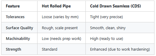 · Mechanical Strength: When we stretch the steel cold, it undergoes "work hardening." The internal grain structure becomes tighter and stronger. This means a cold drawn pipe can often withstand higher pressures than a hot-rolled pipe of the same size.